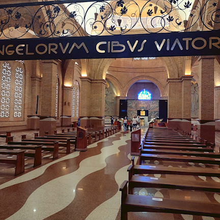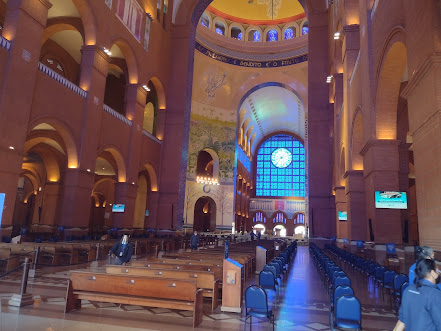 Fui direto para a Cúpula Central. Lá também tem um pequeno museu. É mágico! Eu fiquei tão feliz de estar ali, olhando o Santuário de cima. Foi melhor do que eu esperava. Por mim, teria assistido a missa lá de cima. Assisti uma parte porque não pode demorar muito para dar lugar às outras pessoas poderem olhar também. Tem quatro bancadas que possibilitam uma visão melhor do altar.