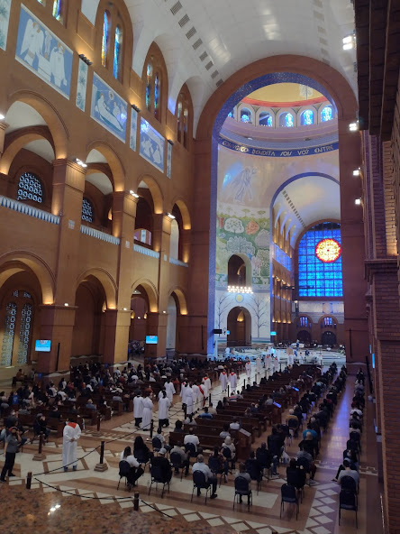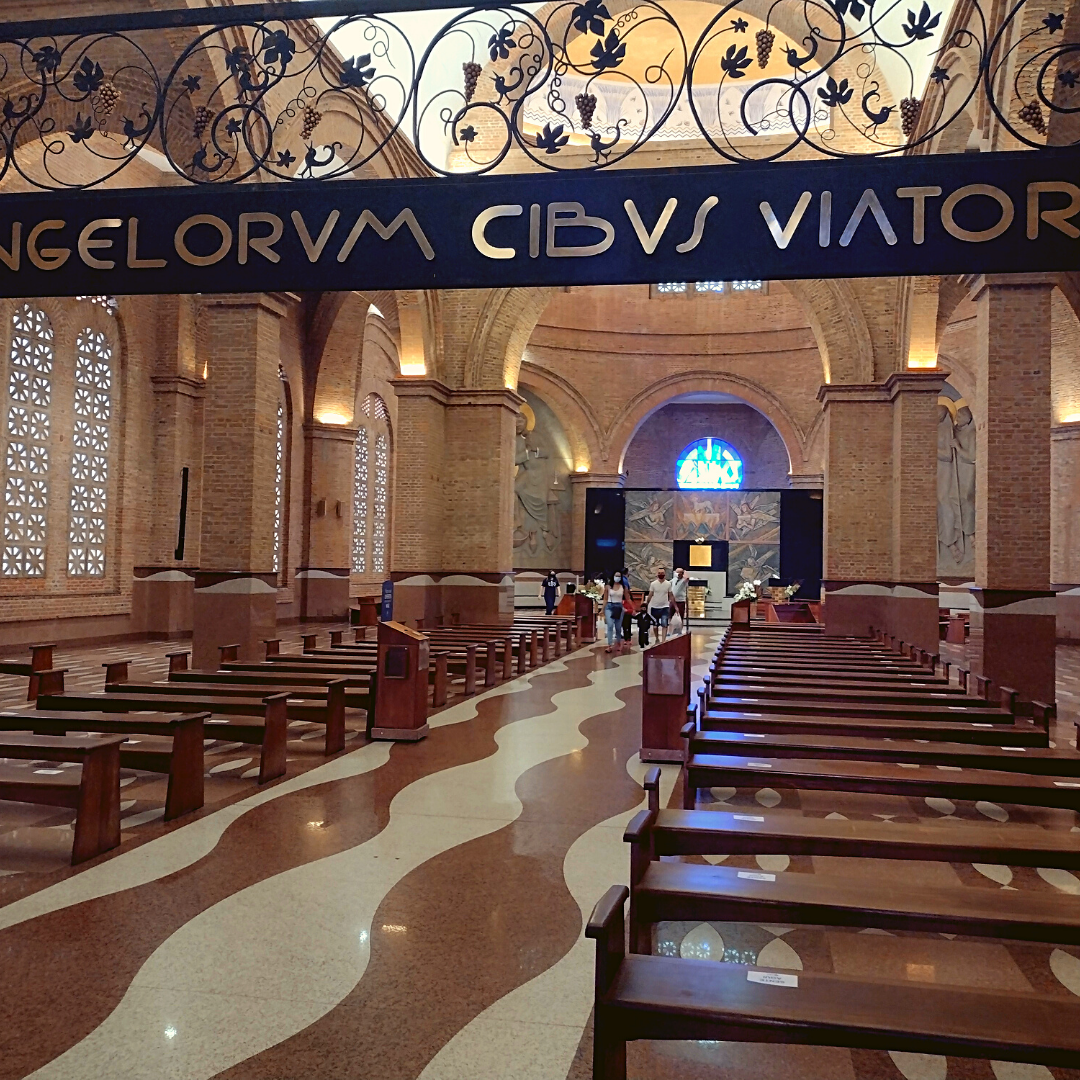 Fui direto para a Cúpula Central. Lá também tem um pequeno museu. É mágico! Eu fiquei tão feliz de estar ali, olhando o Santuário de cima. Foi melhor do que eu esperava. Por mim, teria assistido a missa lá de cima. Assisti uma parte porque não pode demorar muito para dar lugar às outras pessoas poderem olhar também. Tem quatro bancadas que possibilitam uma visão melhor do altar.
